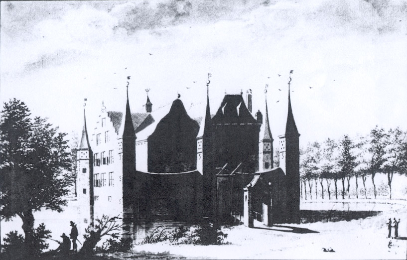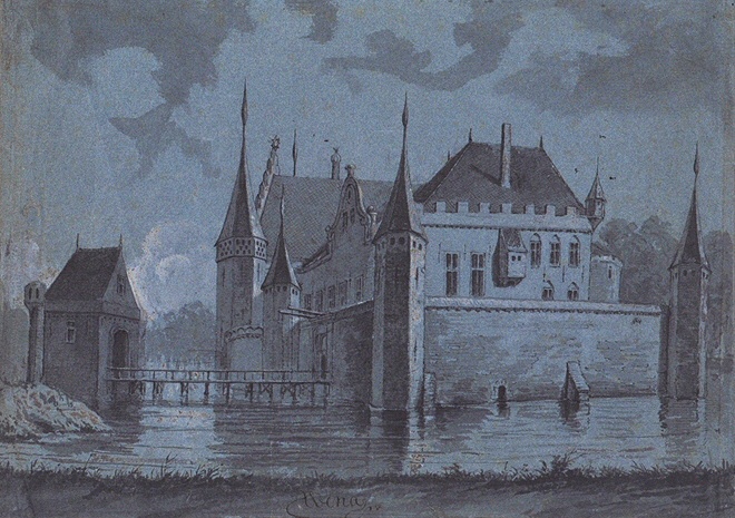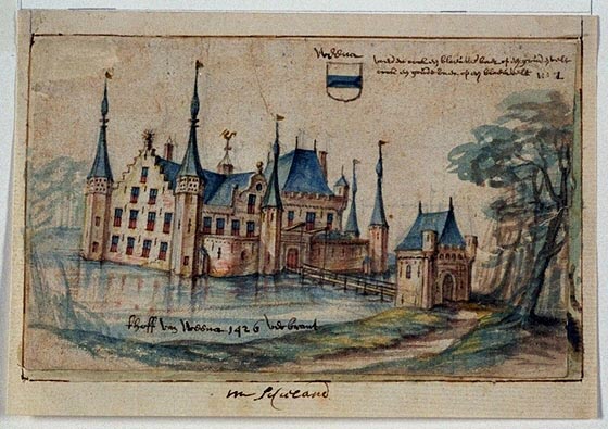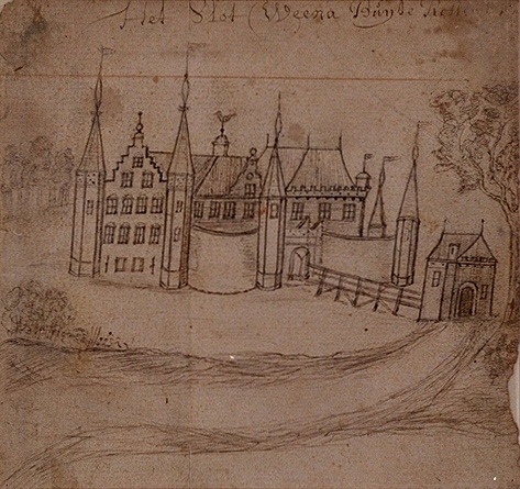 Hof van Weena ca 14e eeuw. Anoniem ca 1830. Inkt, pen en penseel.