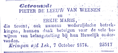 Hij is getrouwd op 7 oktober 1874 met Erkje Maris, geboren te